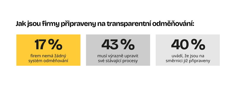 „Šedesát procent firem není připraveno, buďto jim chybí systém odměňování úplně, nebo ho musí zásadně přepracovat. Skoro pětina firem nemá dokonce žádný systém odměňování, který by objektivně vysvětlil a obhájil rozdíly ve mzdách,“ shrnuje výsledky průzkumu Tomáš Jurčík, ředitel Comp&Ben Asociace. V praxi přitom zabere zavedení nebo úprava systému odměňování i několik měsíců intenzivní práce.