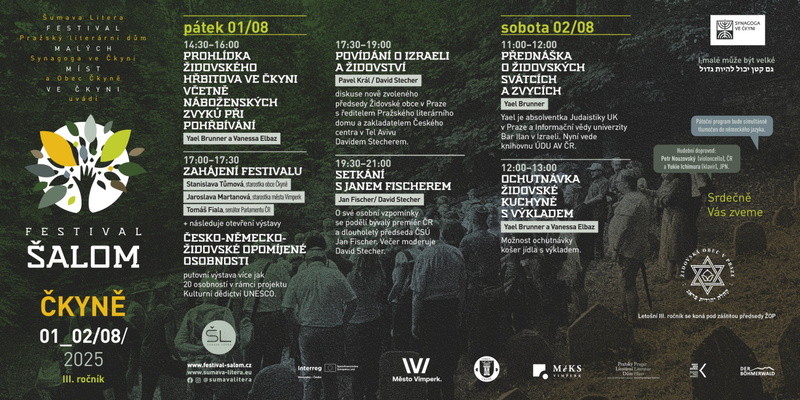 Praha 31. července 2025 (PROTEXT) – V pátek a sobotu 1. a 2. srpna 2025 proběhne třetí ročník festivalu Šalom v synagoze ve Čkyni v Jižních Čechách na Šumavě. „Návštěvníci se mohou tak jako každý rok těšit na pestrý program – diskuse, komentovanou prohlídku, vernisáž výstavy, přednášky o židovských svátcích a zvycích či ochutnávku židovské kuchyně,“ říká David Stecher ředitel pořádajícího Pražského literárního domu.
