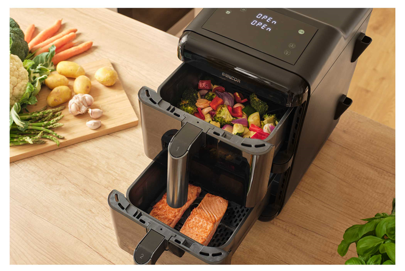 Chcete mít hlavní jídlo a přílohu hotové najednou a hlavně zdravě? Sencor SFR 1250BK (doporučená cena 3 999 Kč) je dvoušuplíková horkovzdušná fritéza, která vám umožní připravit maso a přílohu ve stejný čas, aniž by se chutě mísily. Dva oddělené koše s kapacitou 2x 5,8 litru pojmou i větší porce, ideální pro větší domácnost nebo návštěvy.