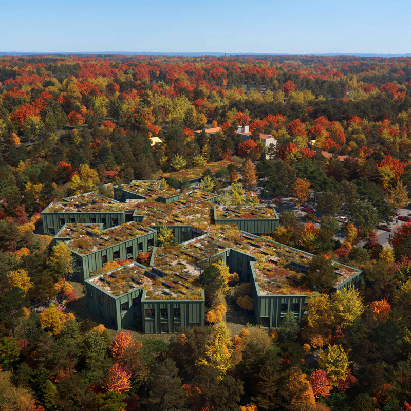 Budova je navržena s důrazem na propojení s okolní přírodou. Skládá se z pěti podélných částí směřujících do lesa a propojených centrální halou. Dispozice kombinuje funkčnost s hravostí – kanceláře jsou organizovány kolem sdílených prostor, mezi sekcemi vznikají zelená nádvoří, kterými se prostor přirozeně rozšiřuje do lesa, zatímco les se organicky prolíná zpět do struktury budovy.