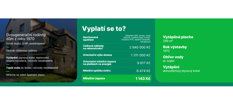 Ano, i rozsáhlá rekonstrukce staršího domu může dávat ekonomický smysl. „V modelovém příkladu dvougeneračního domu z roku 1970 se díky kombinaci zateplení, výměny oken, nové střechy, rekuperaci a instalaci tepelného čerpadla a fotovoltaiky snížily měsíční náklady na energie o 9617 Kč. I po odečtení splátky úvěru zůstává domácnosti každý měsíc více než tisícikorunová úspora. Kromě nižších nákladů na provoz získáte zdravější vnitřní prostředí, vyšší komfort a hodnotnější nemovitost,“ vysvětluje Milan Pospíšil.