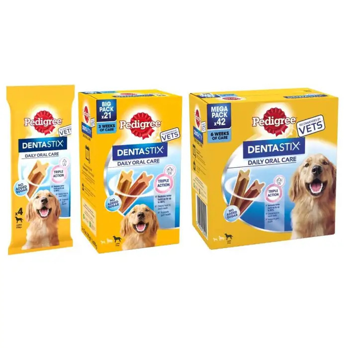 Další možnost představují speciální pamlsky, které díky svému tvaru a struktuře pomáhají čistit chrup, jako jsou PEDIGREE DentaStix. Tyto pamlsky jsou důležitým doplňkem komplexní domácí péče o tlamu, protože spolu s čištěním zubů mohou pomoci výrazně snížit usazování plaku a tvorbu zubního kamene.