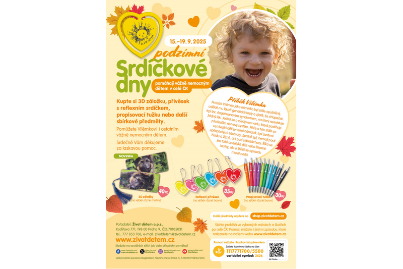Praha 8. září 2025 (PROTEXT) – V týdnu od 15.9. do 19.9.2025 pořádá Život dětem tradiční podzimní Srdíčkové dny na pomoc rodinám s vážně nemocnými dětmi, které podporuje už od roku 2000.