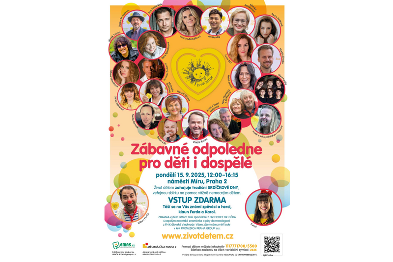Praha 8. září 2025 (PROTEXT) – Život dětem o.p.s. pořádá už tradiční Zábavné odpoledne pro děti a dospělé, kterým zahajuje podzimní Srdíčkové dny, veřejnou sbírku na pomoc rodinám s vážně nemocnými dětmi. Těm pomáhá už dlouhých 25 let.