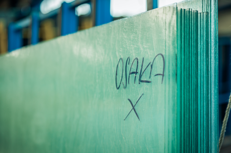 AGC na fasádu pětipodlažní dřevostavby vyrobilo a dodalo 332 skleněných panelů v podobě vrstveného bezpečnostního vzorovaného kaleného skla opatřeného uměleckým vzorem. „Celkem jsme na fasádu spotřebovali téměř 3.500 m2 skloviny o hmotnosti 55,8 t. Každý skleněný panel o celkové tloušťce 25 mm tvoří vždy tři skleněné tabule spojené dvěma bezpečnostními PVB fóliemi (pozn. red. polyvinylbutyralová fólie, bezpečnostní mezivrstva zvyšující odolnost panelů): dvě tabule jsou z čirého skla Planibel Clearlite a jedna tabule je ze vzorovaného skla Imagin Gothic. Umělecký vzor je jak na jedné vnější tabuli čirého skla, tak i na vnitřním vzorovaném skle. Použili jsme čiré sklo ze závodu Řetenice a vzorované sklo ze závodu Barevka. A právě závod Barevka se může od letošního února chlubit jednou z nejmodernějších a nejekologičtějších sklářských pecí na světě,“ říká ředitel závodu AGC Processing Teplice, kde bylo zasklení českého pavilonu zpracované, Petr Sytař.