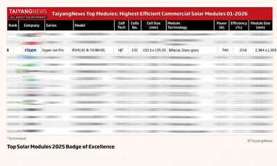 Ning-po (Čína) 23. ledna 2026 (PROTEXT/PRNewswire) – Globální platforma s autoritou v oblasti fotovoltaiky TaiyangNews nedávno zveřejnila svůj první seznam NEJLEPŠÍ SOLÁRNÍ MODULY 2026. Moduly Hyper-ion Pro HJT společnosti Risen Energy si zajistily místo mezi vedoucí globální trojky díky výkonu 740 Wp při sériové výrobě a účinnosti přeměny 23,8 %.