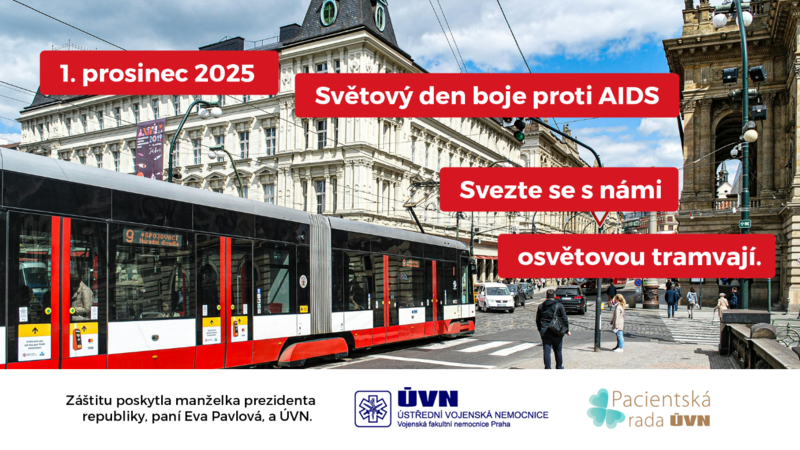 Světový den boje proti AIDS – 1. prosince 2025. Přijďte se svézt osvětovými linkami MHD, které letos vyjedou pod záštitou manželky prezidenta České republiky, paní Evy Pavlové, a Ústřední vojenské nemocnice