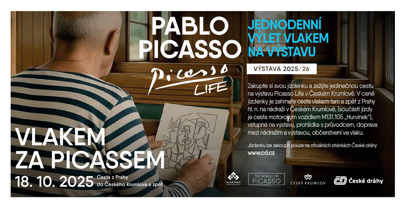 Pokud jste tuto cestu nestihli, čeká vás ještě jedna nabídka ve spolupráci s Českými Drahami. Vydejte se v období od 1.10.2025 do 31.12.2025 vlakem “Jižní expres” (IC 533), směr Praha hl. n. – nádraží Český Krumlov a získejte slevu na vstup na výstavu Picasso Life v Českém Krumlově 20%. Sleva na vstupné platí 10 dní od data jízdenky a jízdenka musí být předložena u pokladny Galerie Klášterů Český Krumlov při zakoupení vstupu. Sleva se vztahuje na jednu vstupenku a na jednu jízdenku. Směr jízdy a počet zastávek neomezuje nárok na slevu. Více informací na www.theworldofpicasso.com, jízdenku na vlak zakoupíte na www.cd.cz .