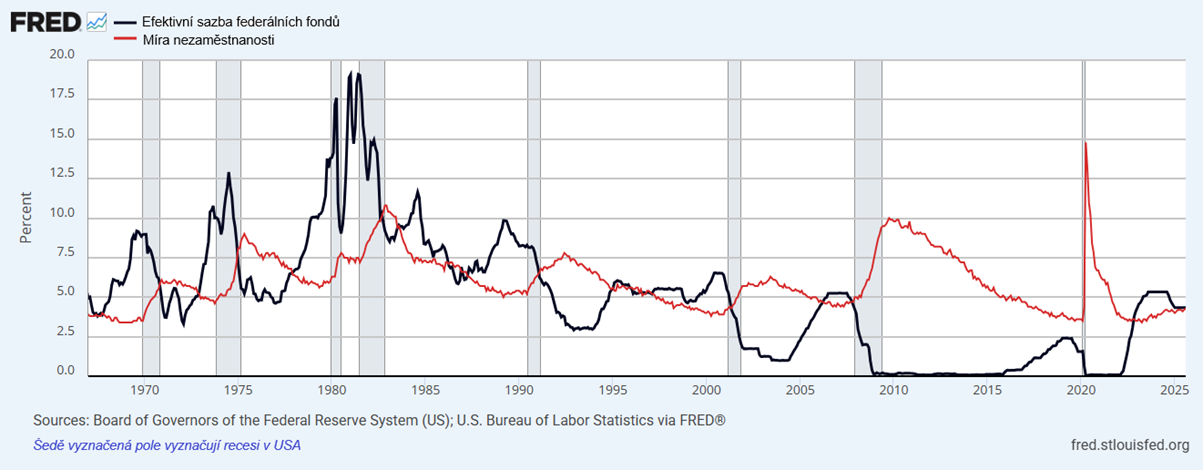 Pracovní trh v USA není v optimální kondici a ačkoli míra nezaměstnanosti neroste zatím parabolickým tempem, soukromý sektor je v dlouhodobém útlumu. Tento útlum ale byl z velké části a stále je kompenzován zvýšenými výdaji veřejného sektoru, což se ještě donedávna odráželo na zdánlivě zdravých statistikách pracovního trhu. Drtivá většina růstu v počtu pracovních míst během tohoto roku byla v sektoru zdravotnictví. Naopak ve výrobě či stavebnictví celkový počet míst letos klesá. Pokud je ale rozhodnutí o sazbách skutečně ovlivňováno politickými tlaky, například ze strany Trumpovy administrativy, pak rozhodnutí Fedu nemusí být nezávislé. Tím pádem by nový cyklus snižování sazeb nemusel být nutně předznamenáním ekonomického zpomalení.