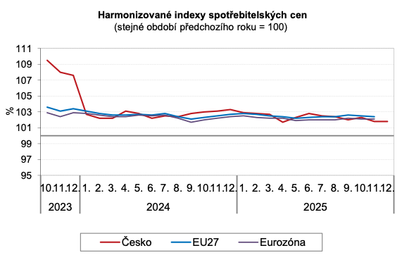 Podle předběžných výpočtů harmonizovaného indexu spotřebitelských cen (HICP), jímž se porovnává inflace v zemích Evropské unie, v prosinci v Česku meziměsíčně ceny klesly o 0,3 % a meziročně HICP vzrostl o 1,8 % (v listopadu také o 1,8 %). Podle bleskových odhadů Eurostatu byla meziroční změna HICP v prosinci 2025 za Eurozónu 2 % (v listopadu 2,1 %), v Německu 2 %. Nejvíce ceny v prosinci vzrostly na Slovensku a v Estonsku (shodně o 4,1 %) a nejméně na Kypru (o 0,1 %).
