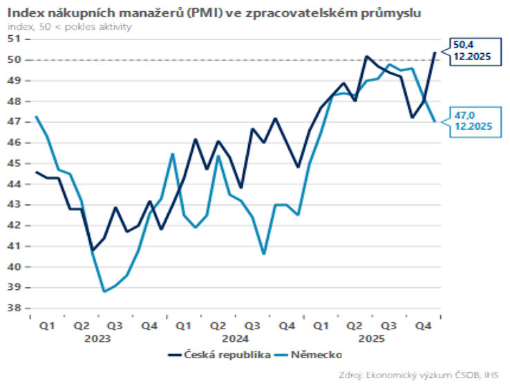 Český průmysl zakončil rok 2025 v překvapivě dobré kondici. Index nákupních manažerů (PMI) se v prosinci zvýšil ze 48 na 50,4 bodu a poprvé od června se posunul do pásma velmi mírného růstu. Zároveň jde o nejlepší hodnotu od května 2022. Ačkoli průmysl po většinu loňského roku přešlapoval na místě, lepší prosincová nálada dává naději na postupné oživení v roce 2026.