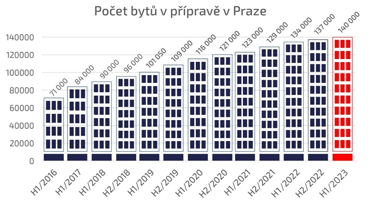 V Praze se nyní připravuje výstavba 140 tisíc bytů. Je to nejvíce od roku 2016. Vzhledem k dlouhodobě pomalému povolování, přetrvávajícím vysokým stavebním nákladům a drahému financování se jich ale na trh dostává jen minimum. I proto se dostupnost bydlení v Praze opět snížila a nadále zůstává nejhorší ze všech okolních metropolí. Píše se to v pravidelné půlroční zprávě trojice developerských společností Central Group, Trigema a Skanska, kterou firmy představily novinářům.