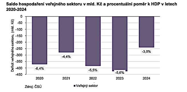 Deficit veřejného sektoru v roce 2024 se prohloubil o 241,3 miliardy korun. Relativně k hrubému domácímu produktu (HDP) se ale snížil o 2,6 procentního bodu na 3 procenta HDP. Ukazuje to analýza satelitního účtu veřejného sektoru, kterou zveřejnil Český statistický úřad.