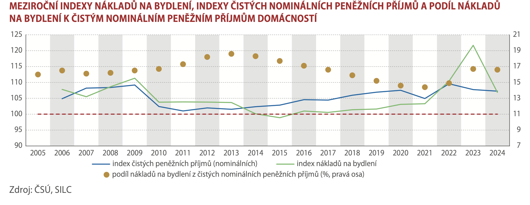 Nápovědu k dalšímu zkoumání poskytují příspěvky na bydlení. Ty podle Úřadu práce ČR v roce 2023 stouply na 18 mld. Kč z 8,5 miliardy korun v roce 2022. Nárůst byl, pravda, způsoben částečně změnou zákonných podmínek pro získání příspěvku, ale tyto změny reagovaly na předchozí prudký růst nákladů na bydlení.