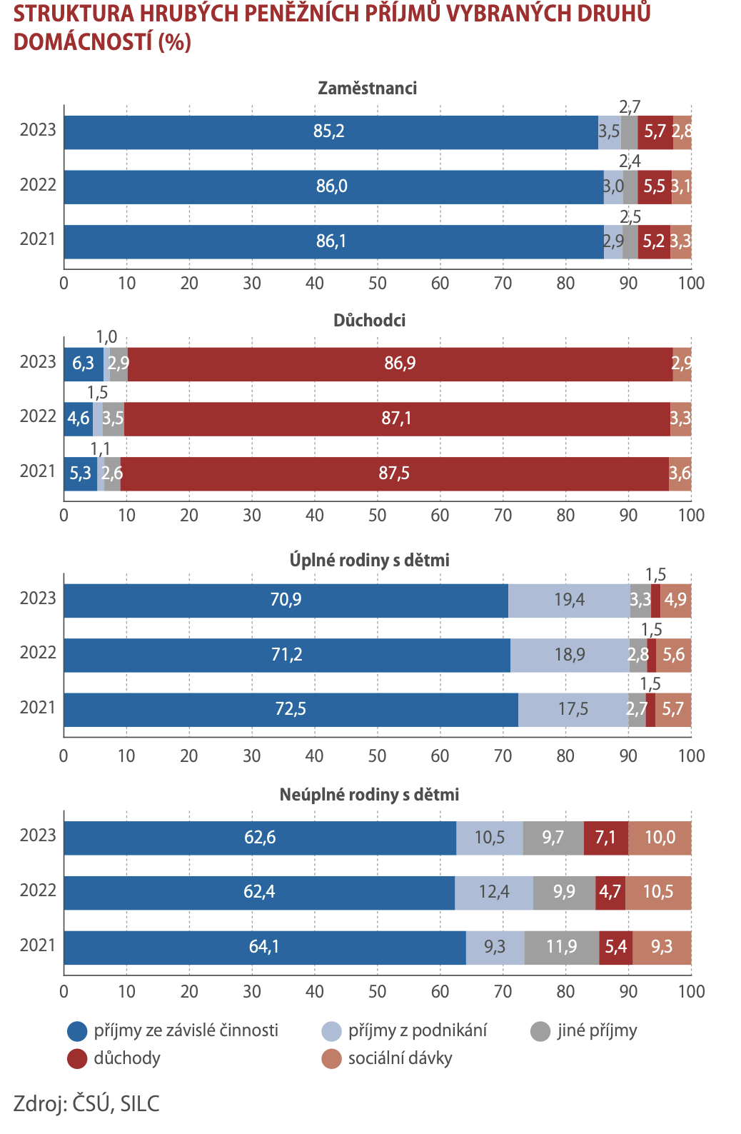 U domácností zaměstnanců tvořily v roce 2023 příjmy ze závislé činnosti 85,2 % celkových hrubých příjmů, což značí pokles o necelý jeden procentní bod od roku 2021. Snížil se i podíl sociálních dávek, konkrétně o 0,5 proc. bodu. Ke stejně velké změně, jen opačným směrem, došlo v daném období u příjmů z podnikání.